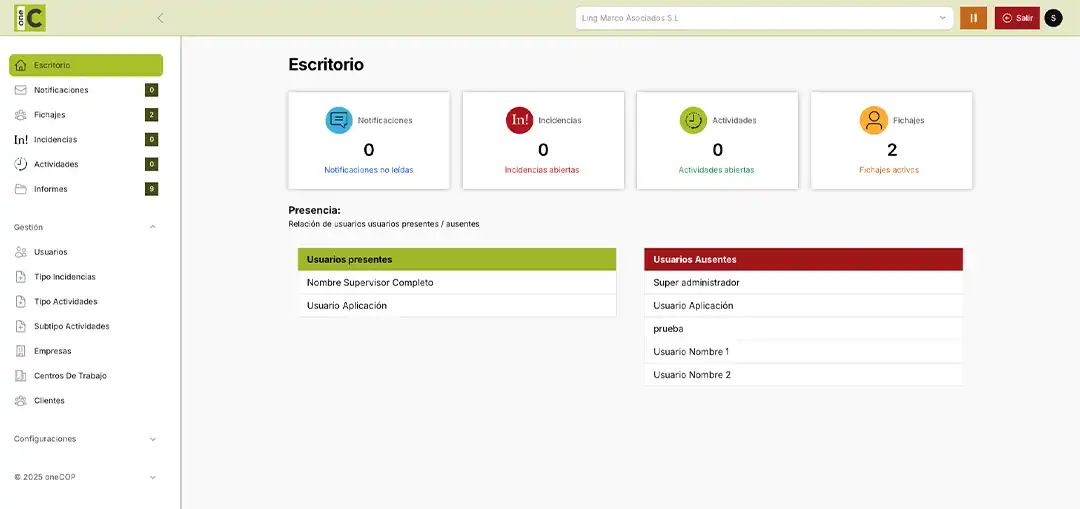 La configuración inicial permite a los supervisores gestionar los elementos esenciales de la aplicación, incluyendo el registro de usuarios, la creación de tipos de incidencias, actividades, empresas, centros de trabajo y clientes.
